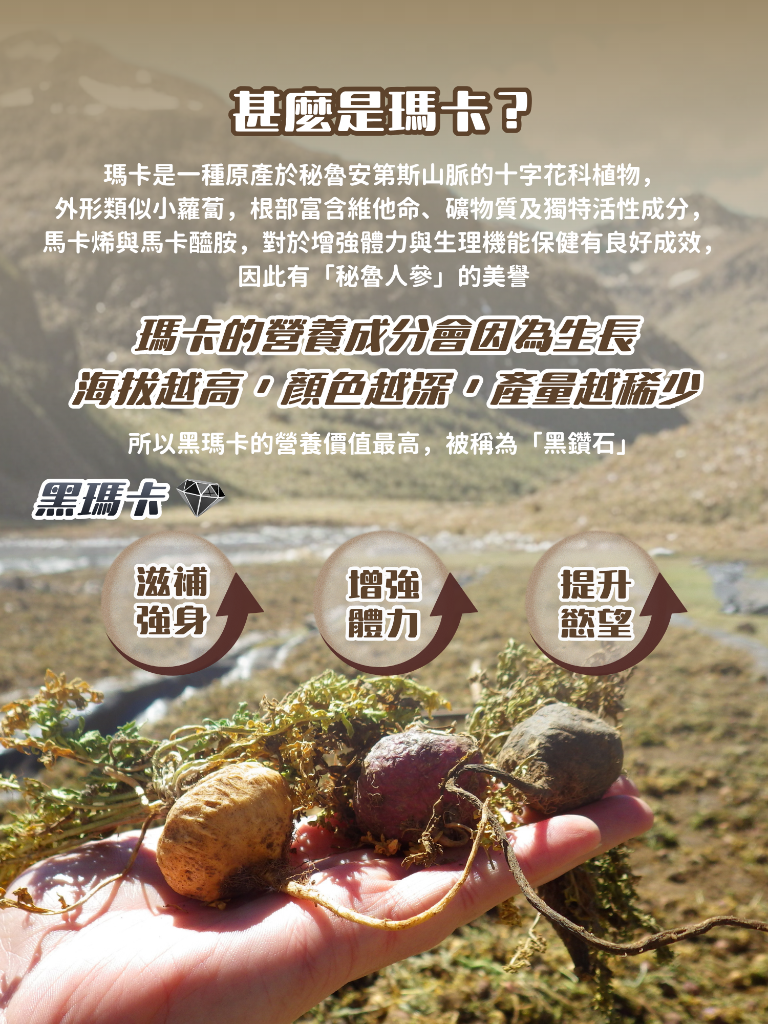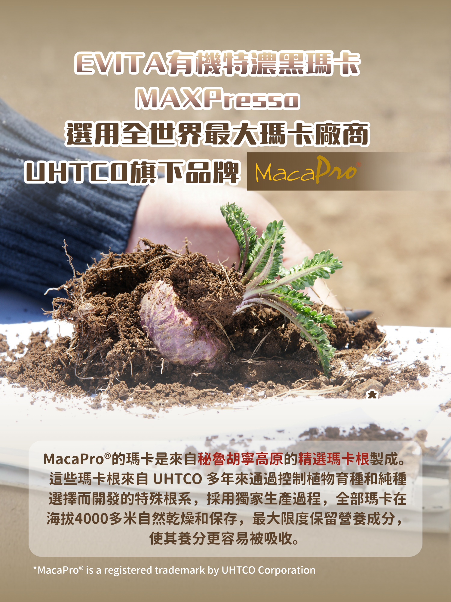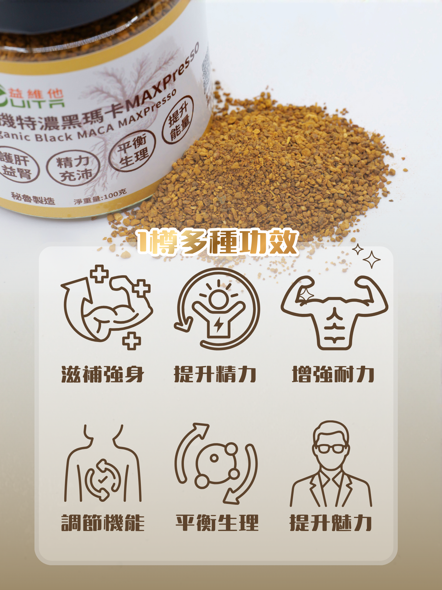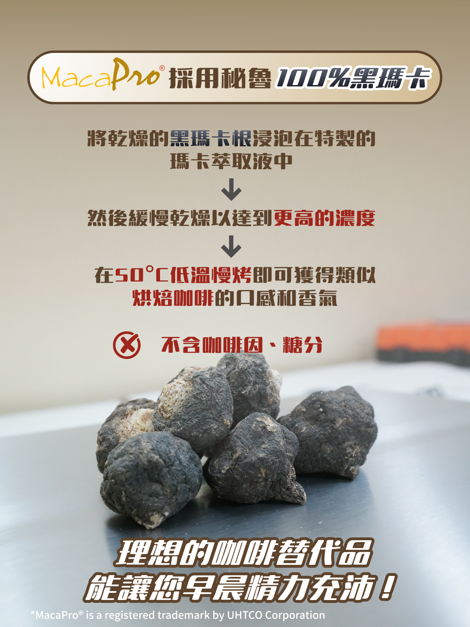 採用全世界最高品質的瑪卡專利原廠MacaPro® *的100%黑瑪卡,獲有機認證。在50°C的低溫慢烤下,瑪卡發出獨特香氣,最大限度保留營養,不含咖啡因和糖分,是理想的咖啡替代品,讓你的早上精力充沛!