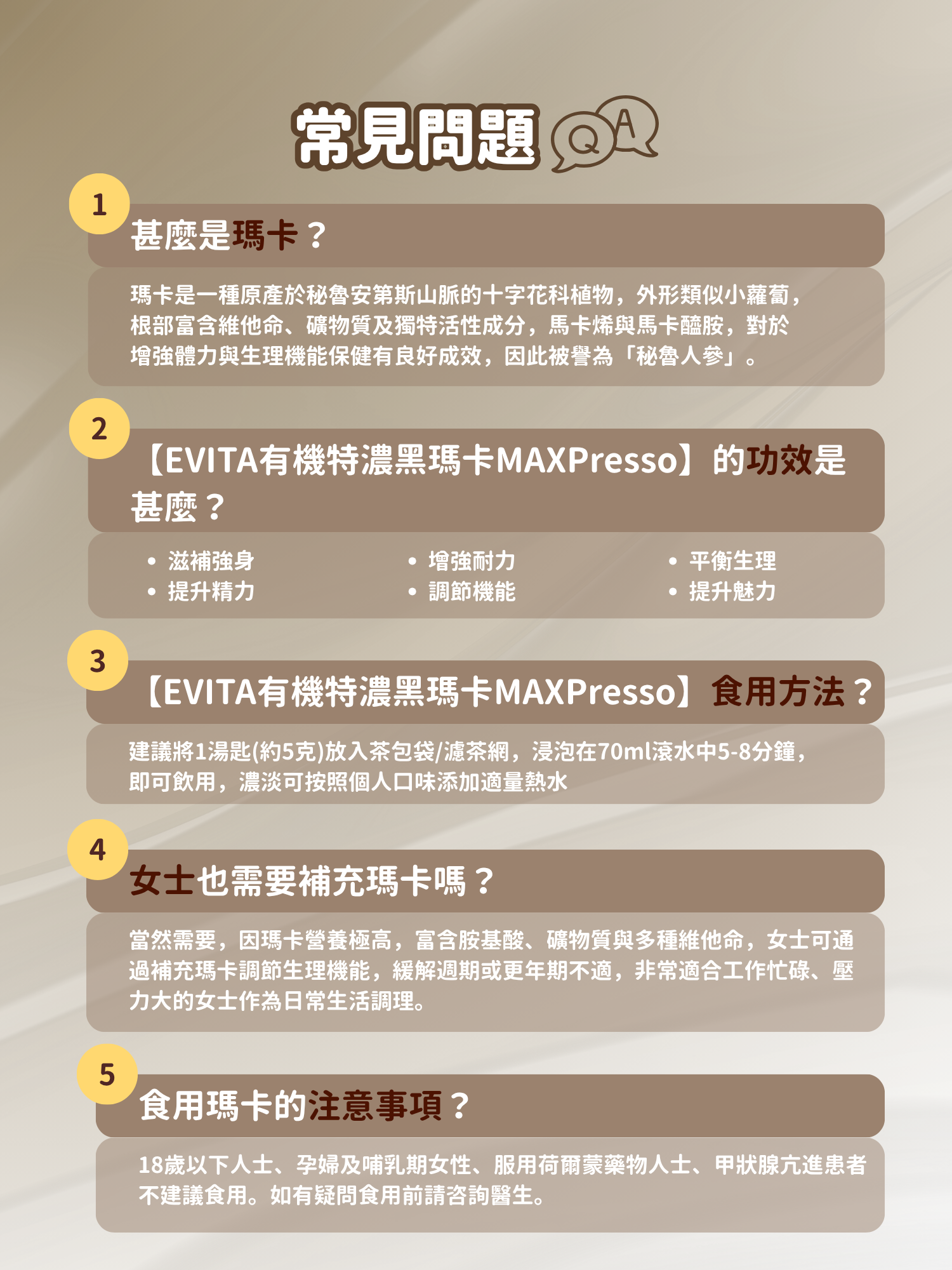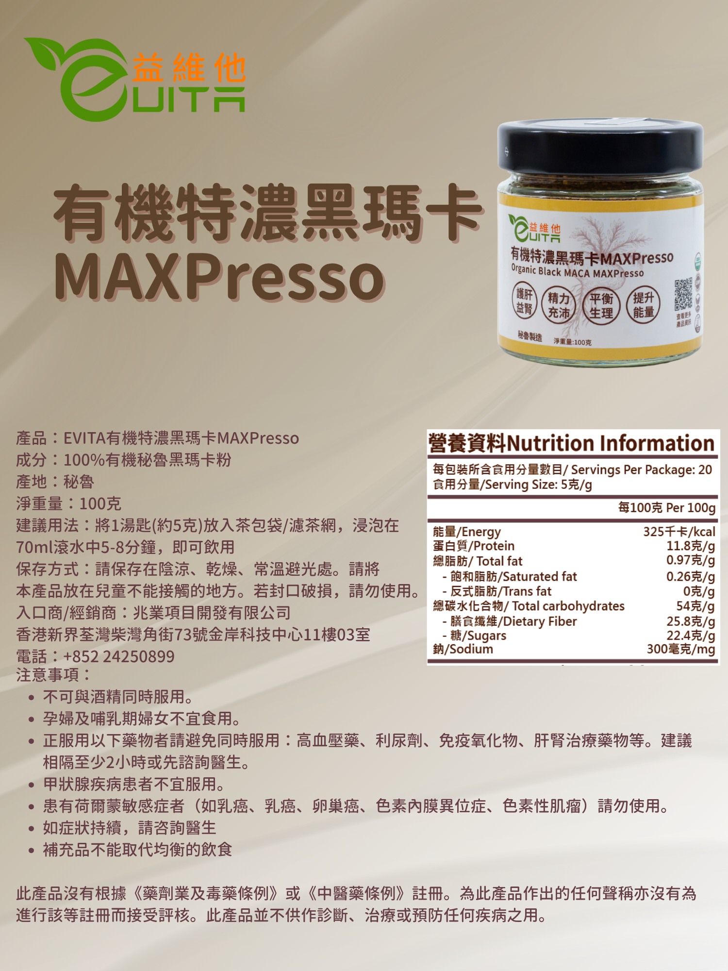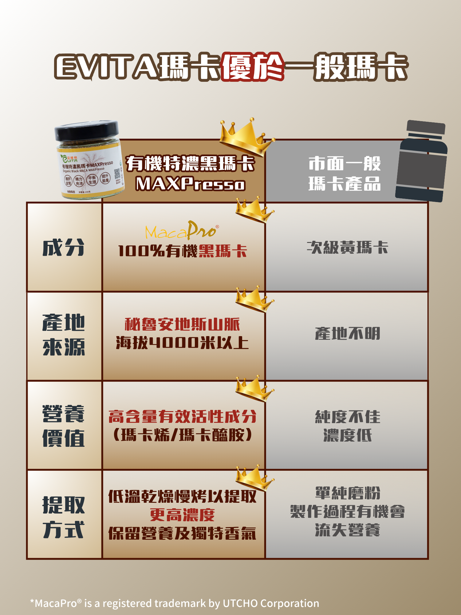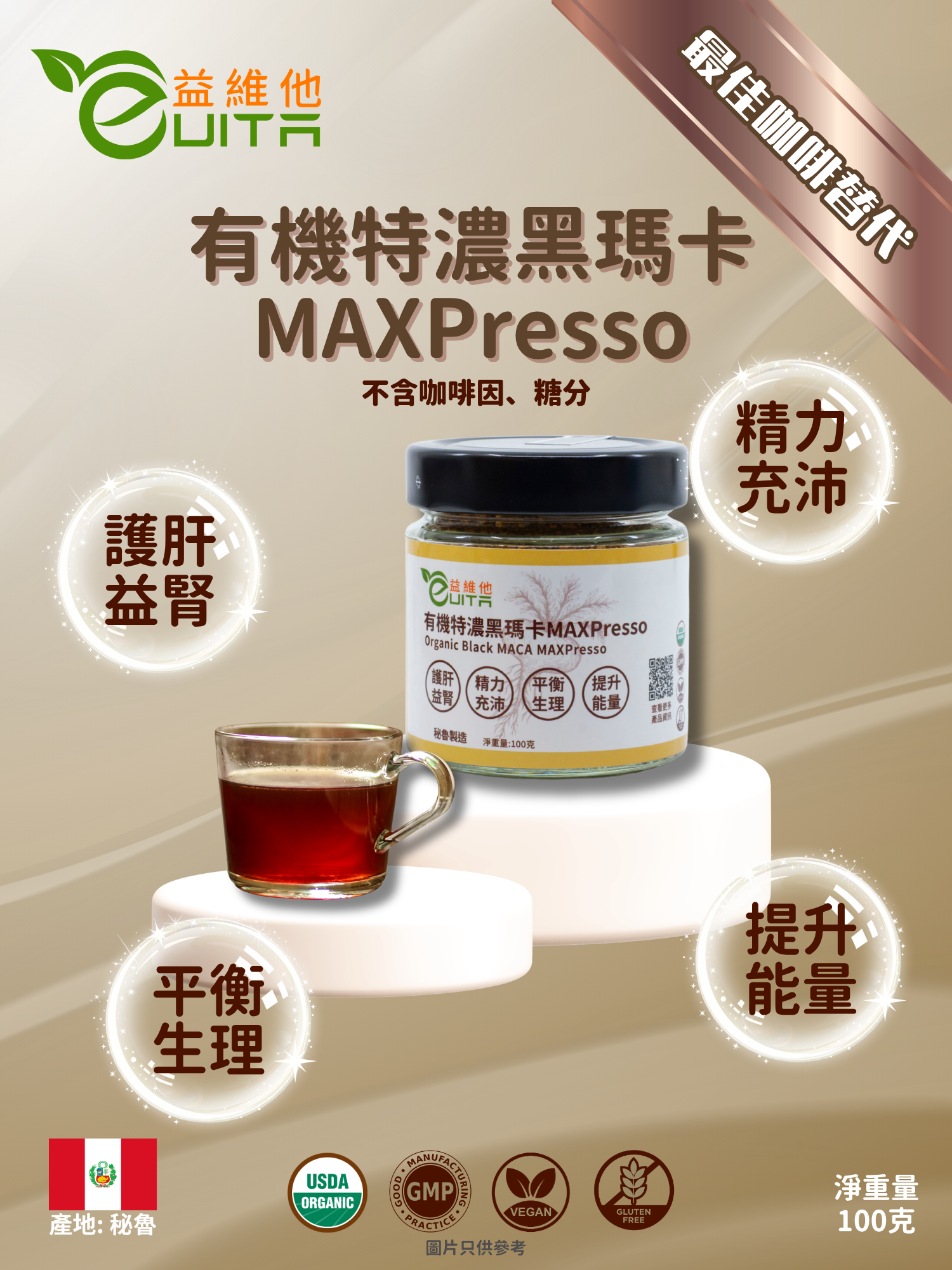 採用全世界最高品質的瑪卡專利原廠MacaPro® *的100%黑瑪卡,獲有機認證。在50°C的低溫慢烤下,瑪卡發出獨特香氣,最大限度保留營養,不含咖啡因和糖分,是理想的咖啡替代品,讓你的早上精力充沛!