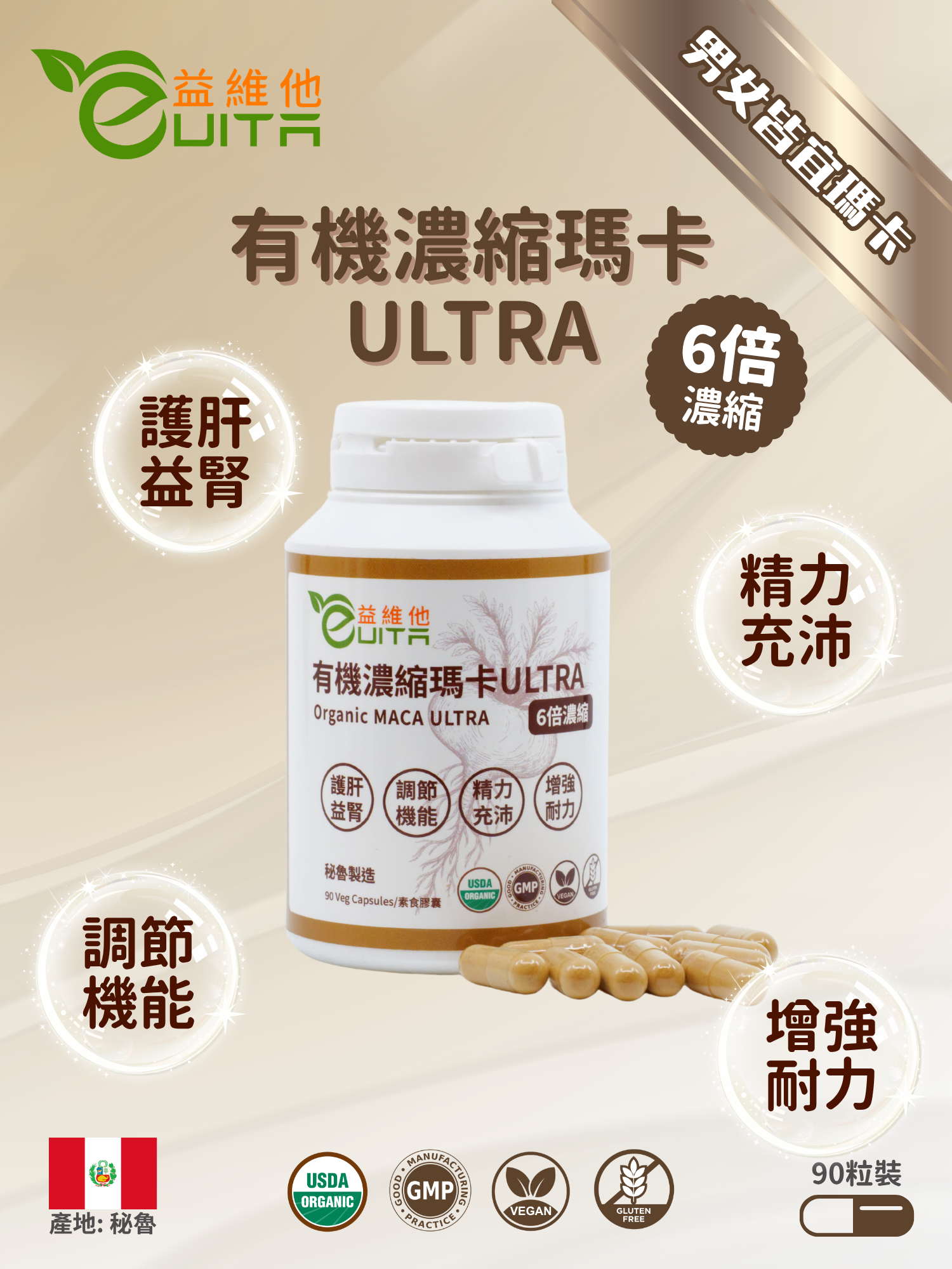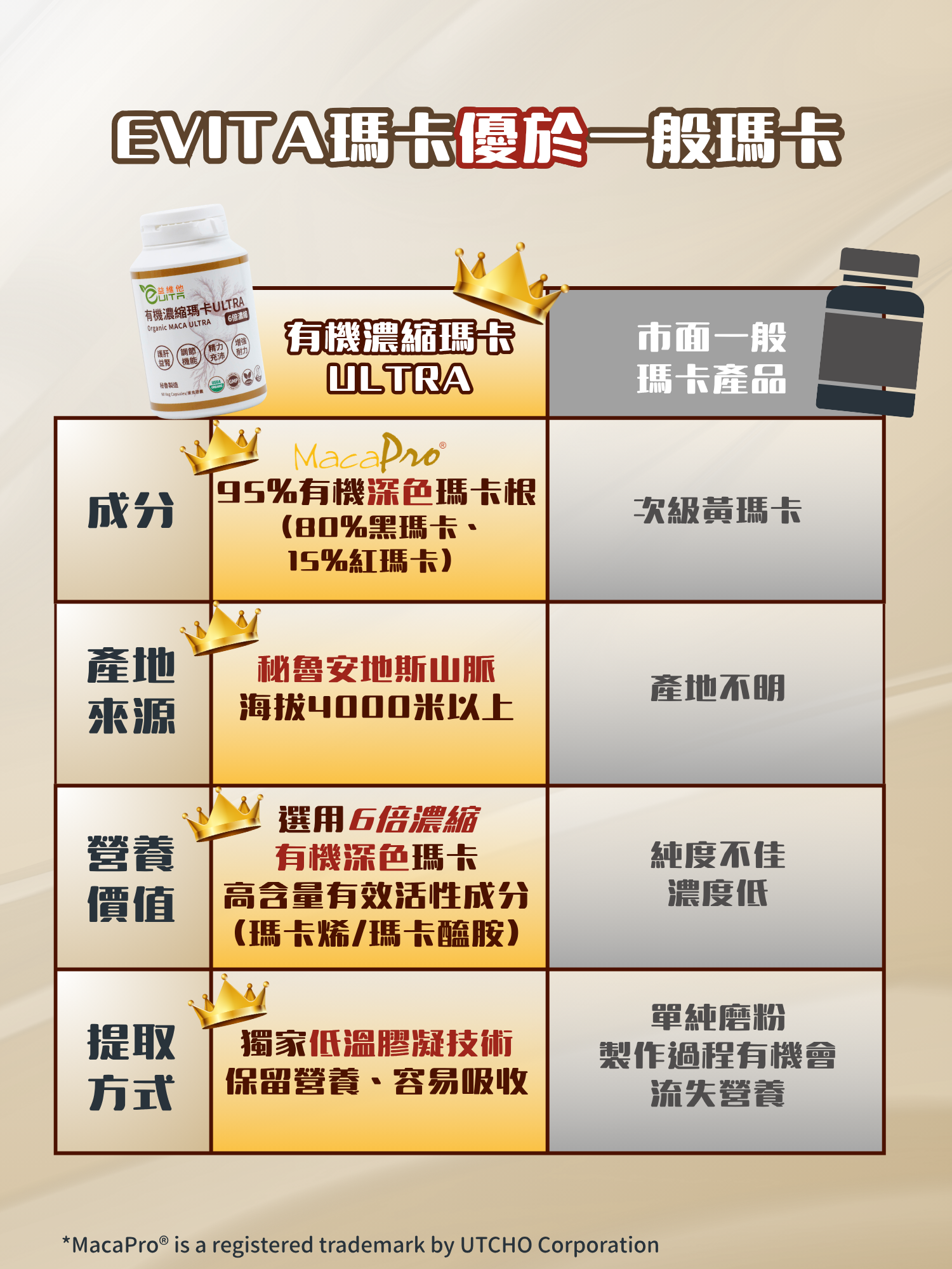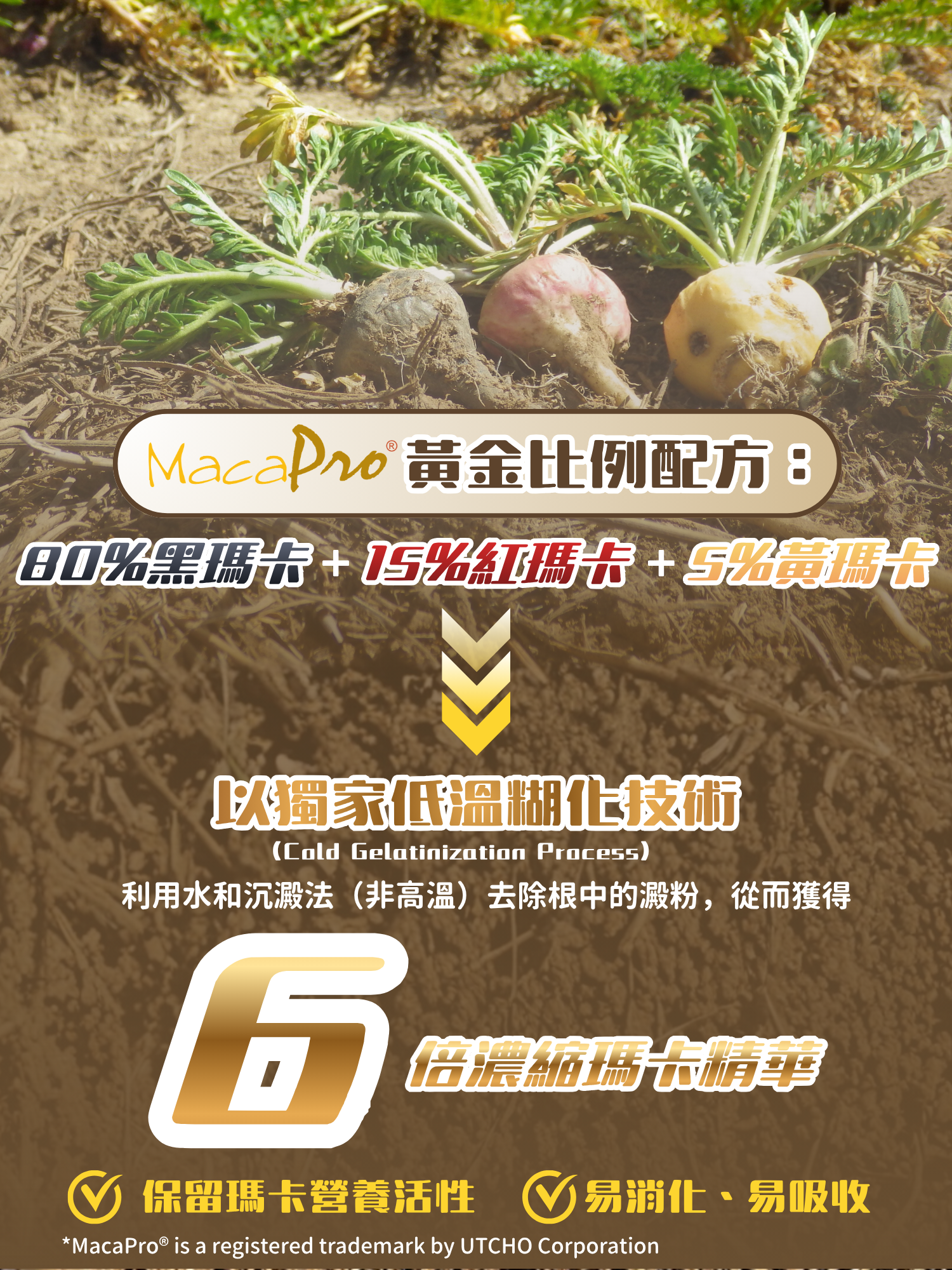 採用全世界最高品質的瑪卡專利原廠MacaPro® *,獲有機認證,配方以黃金比例80%黑瑪卡、15%紅瑪卡和5%黃瑪卡6倍濃縮。獨家低溫糊化技術生產,去除澱粉,無添加,最大限度保留營養活性成分,更易於被人體吸收。