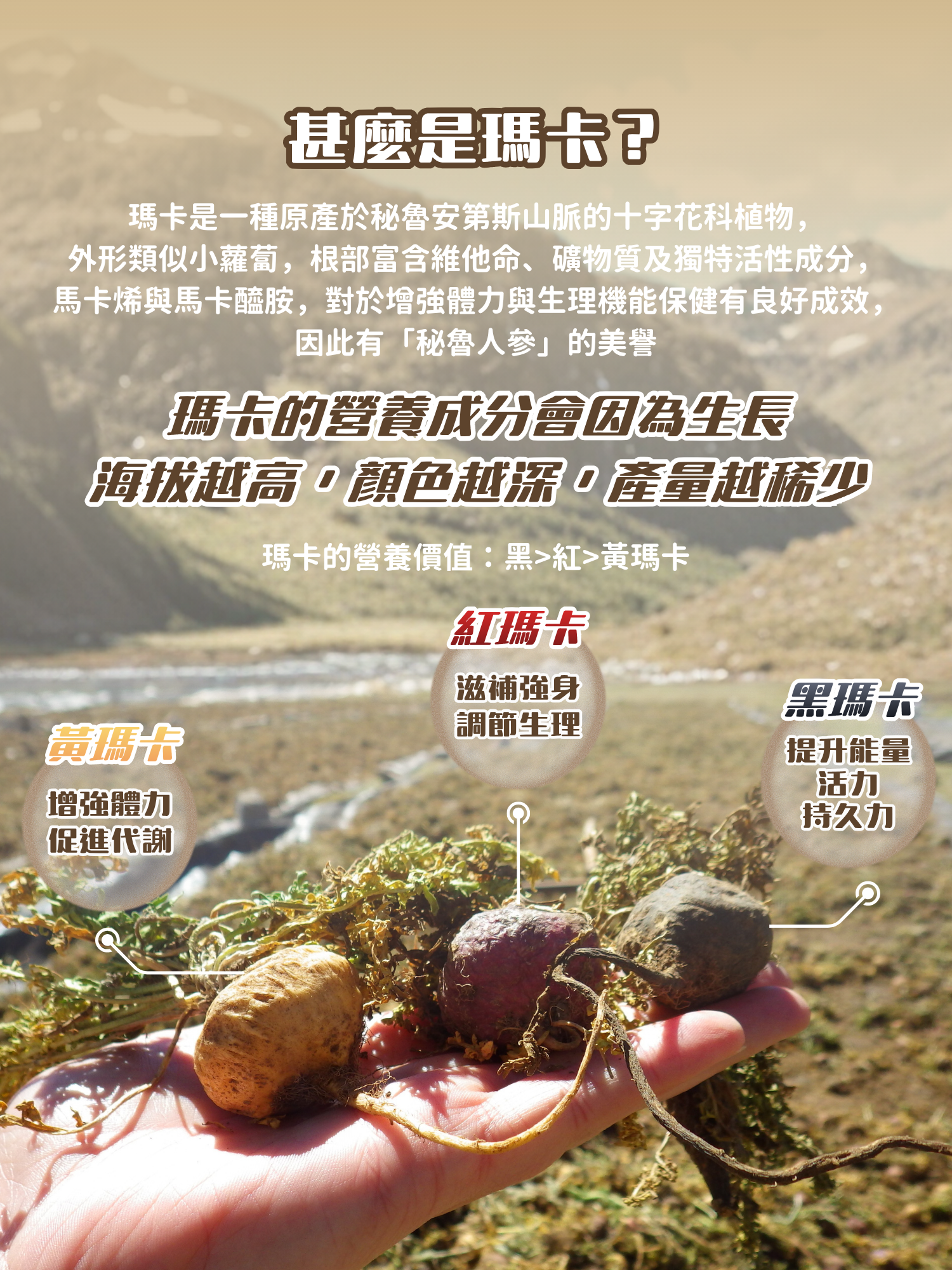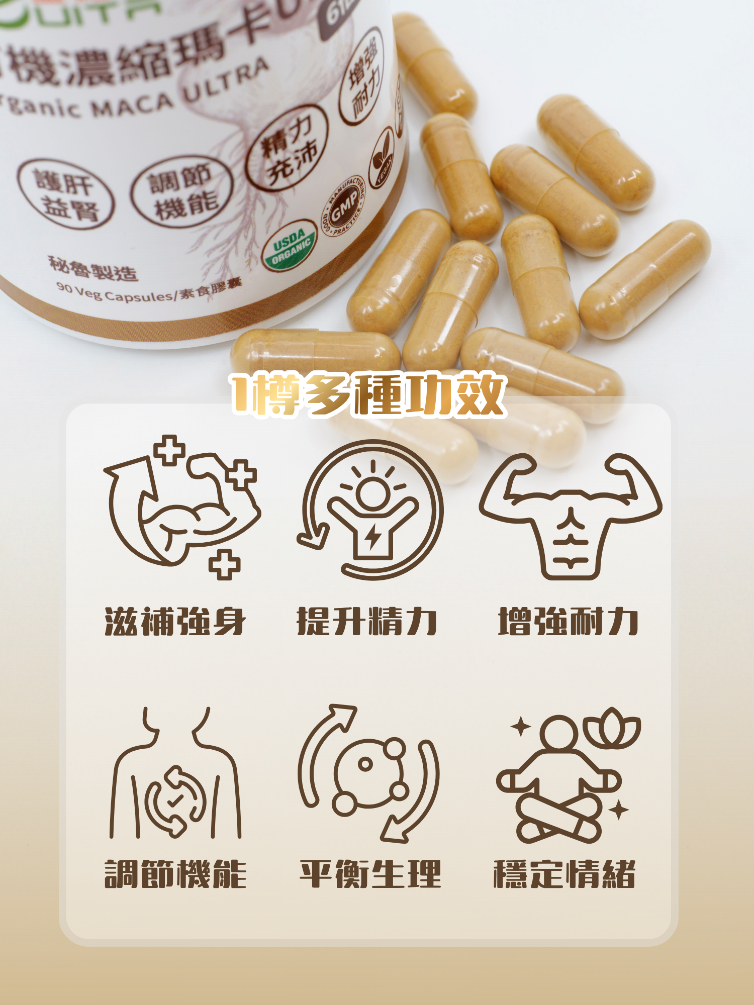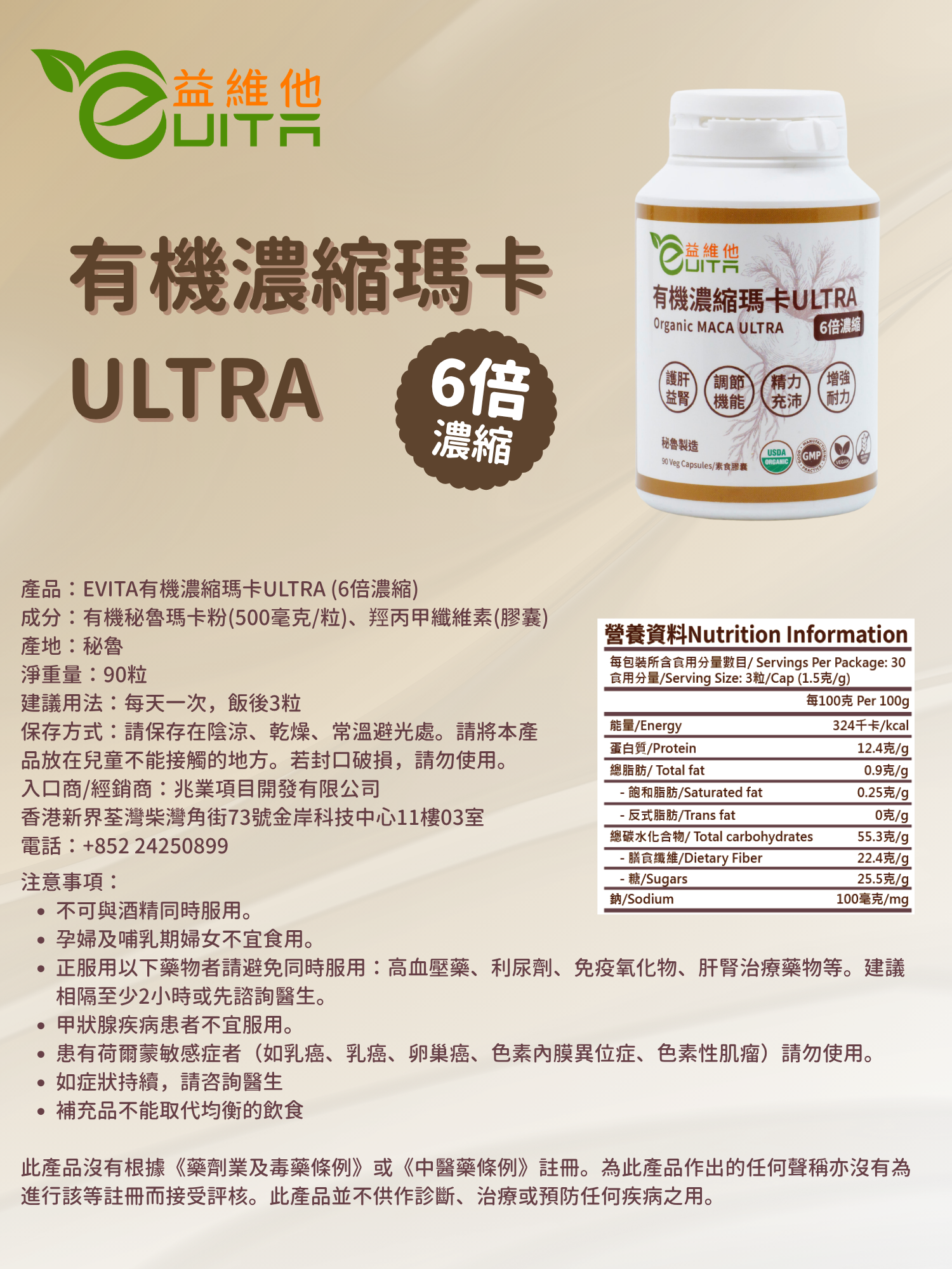 採用全世界最高品質的瑪卡專利原廠MacaPro® *,獲有機認證,配方以黃金比例80%黑瑪卡、15%紅瑪卡和5%黃瑪卡6倍濃縮。獨家低溫糊化技術生產,去除澱粉,無添加,最大限度保留營養活性成分,更易於被人體吸收。