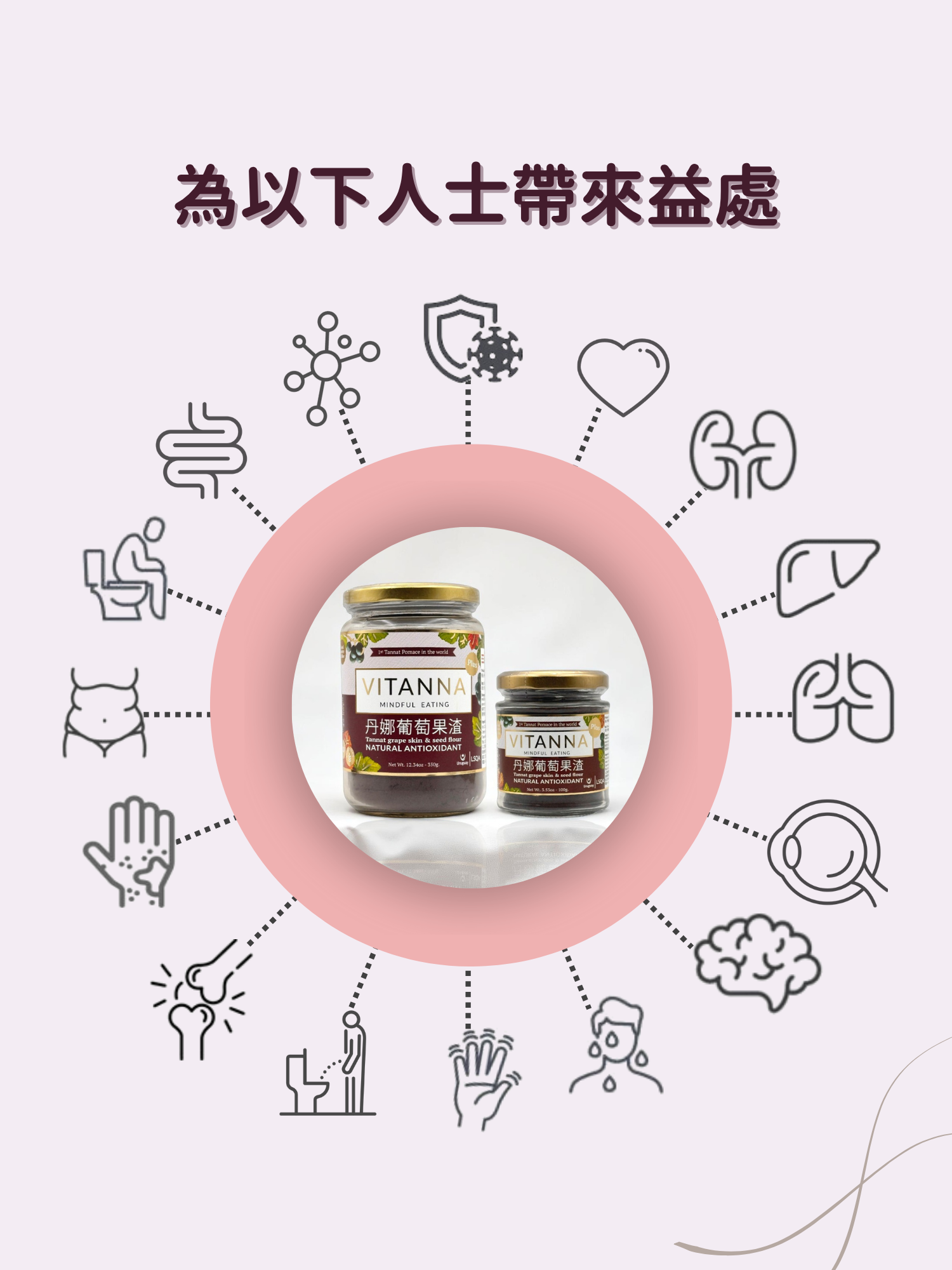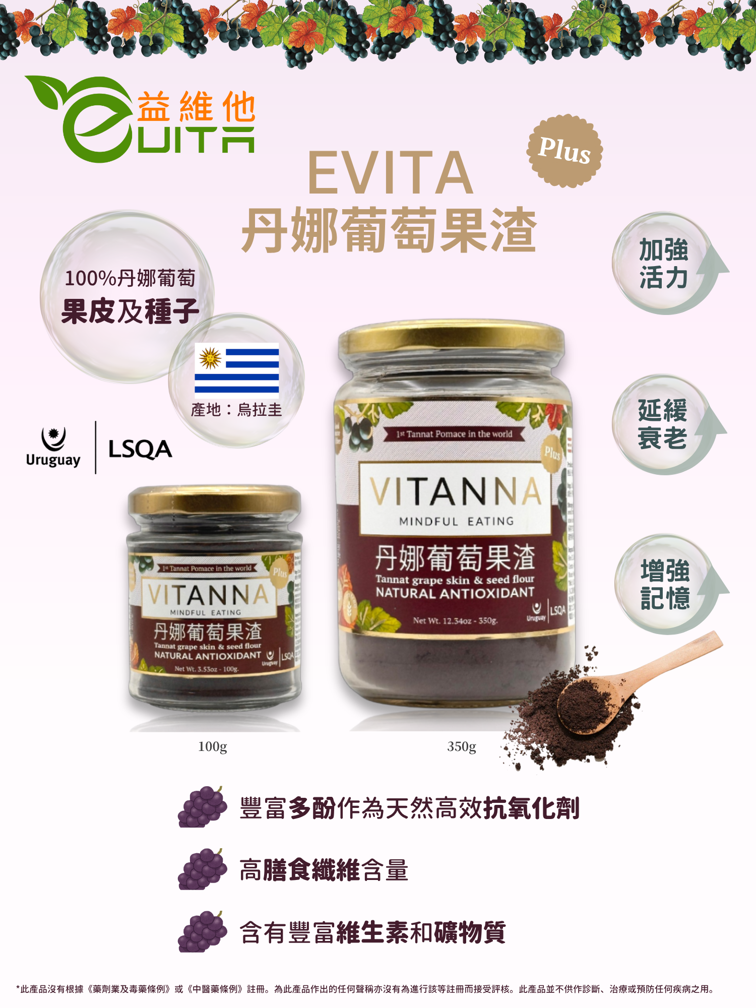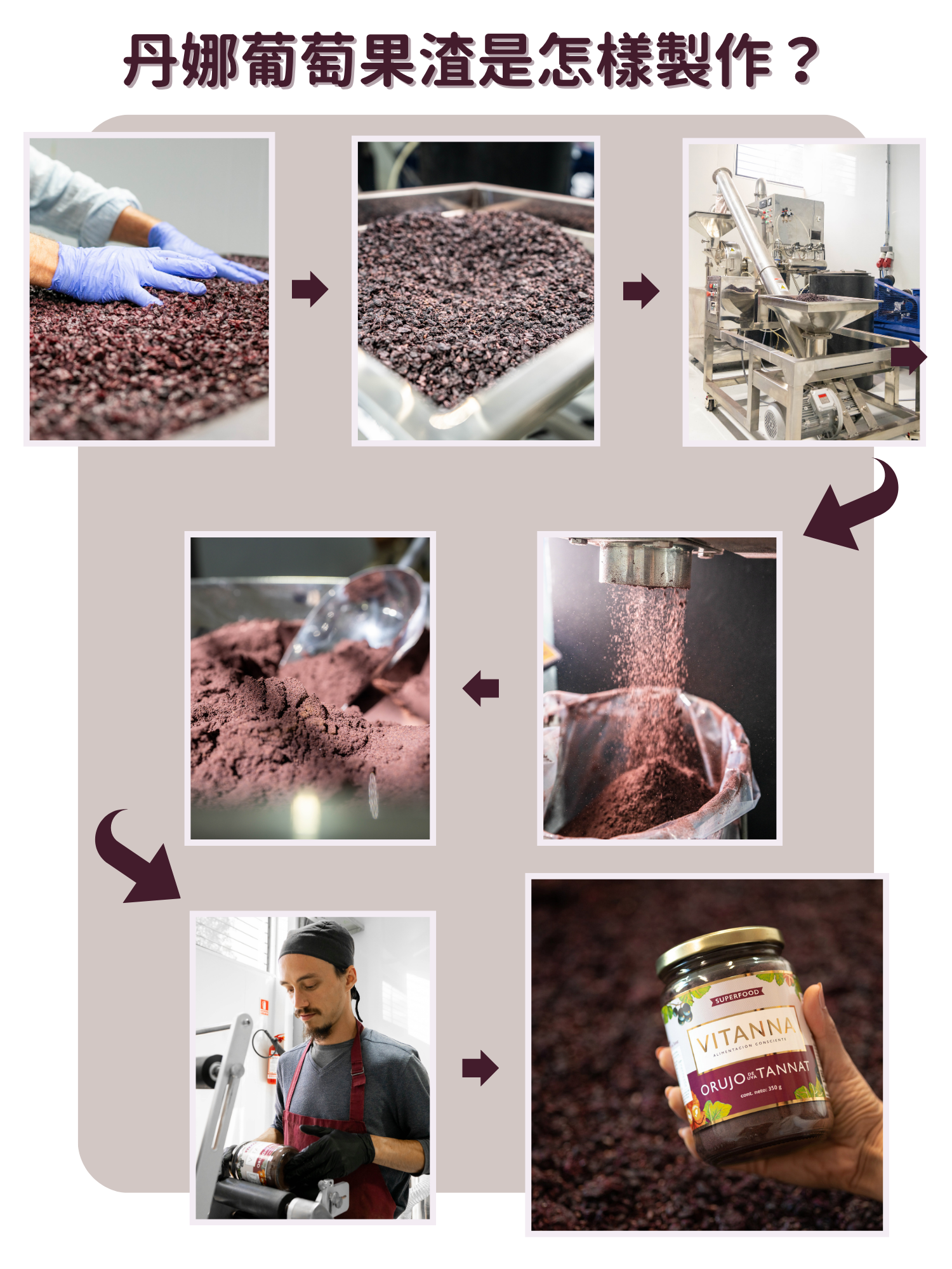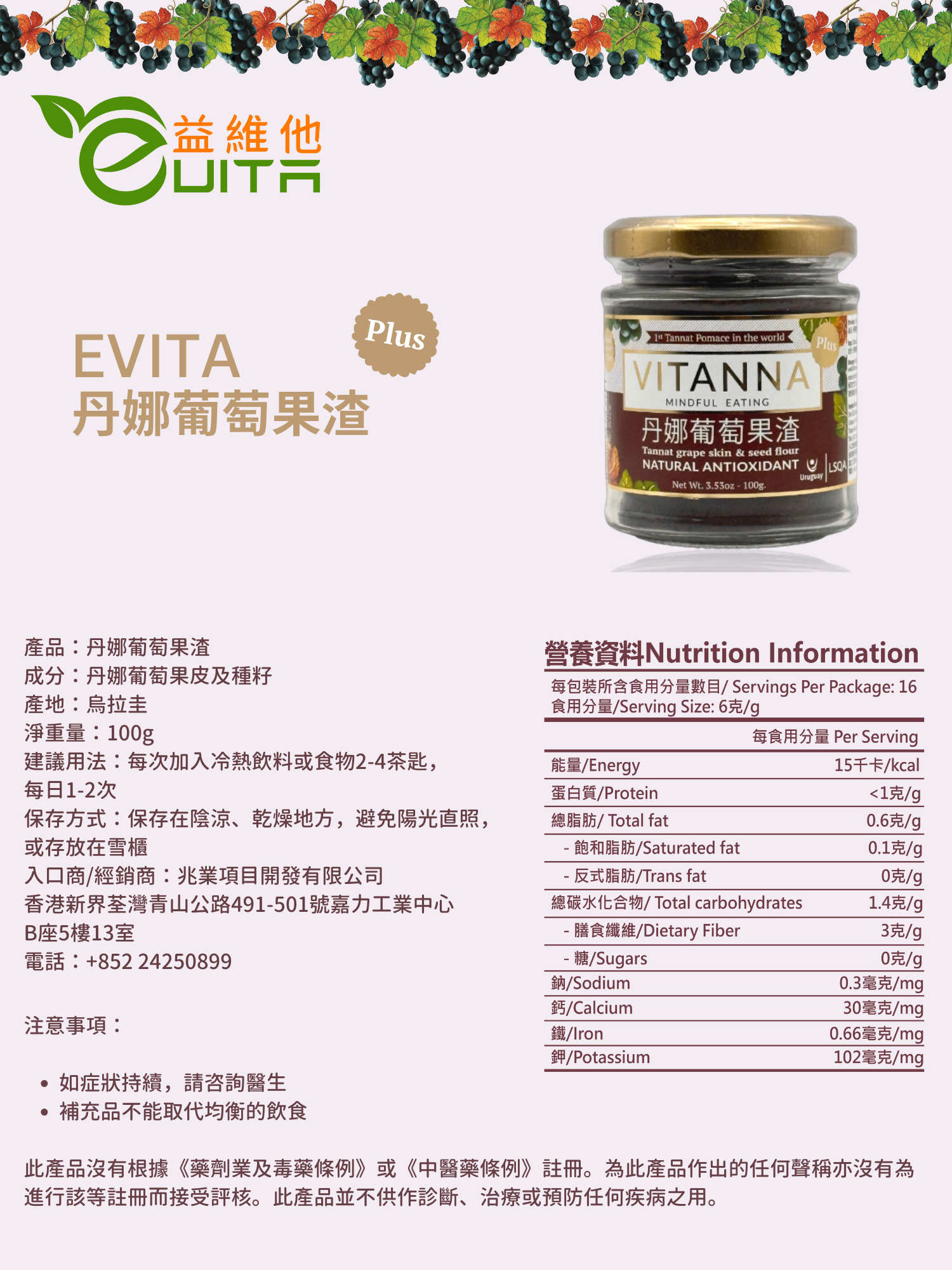 成份 :100%丹拿葡萄果皮,葡萄果種籽