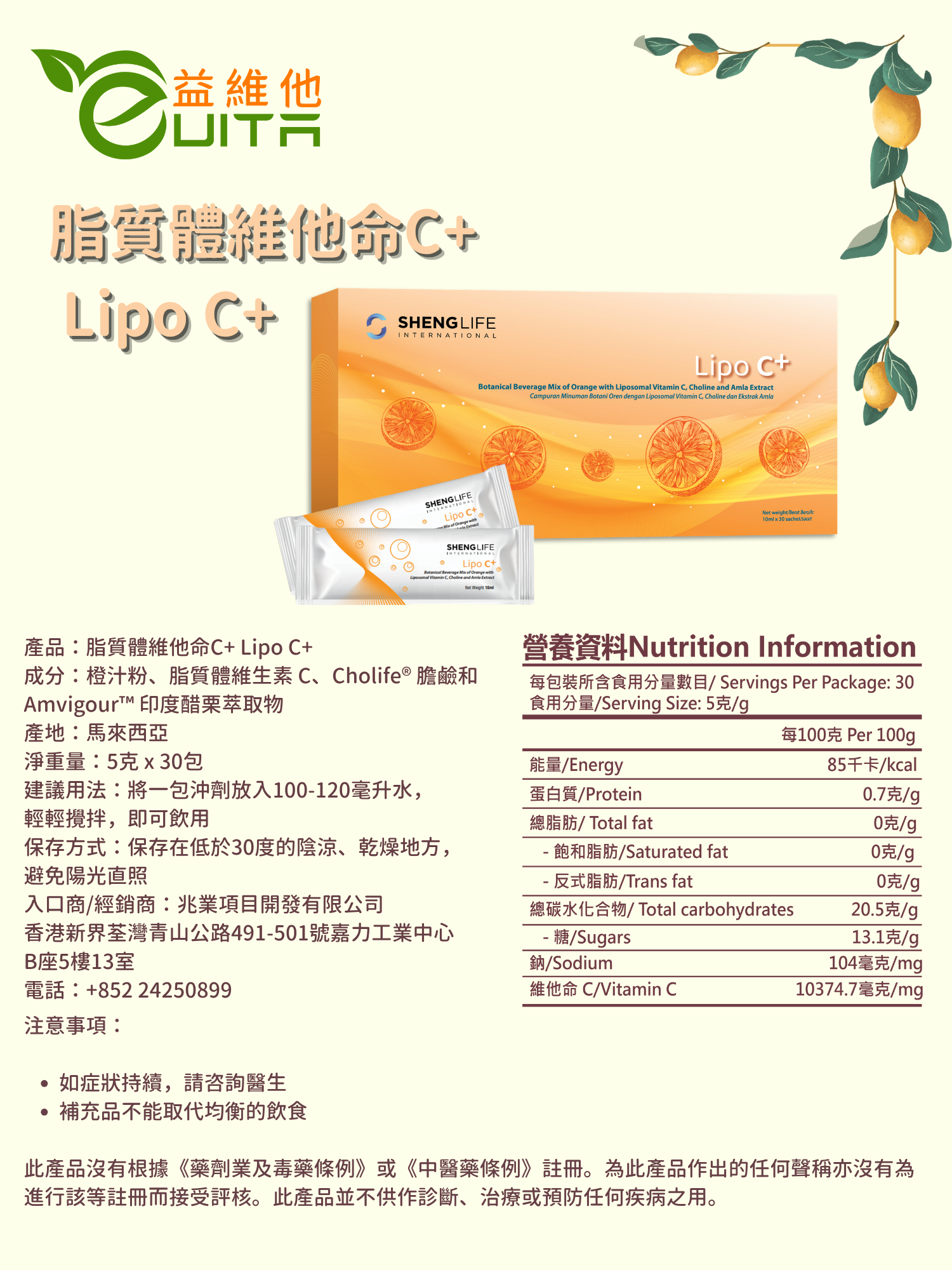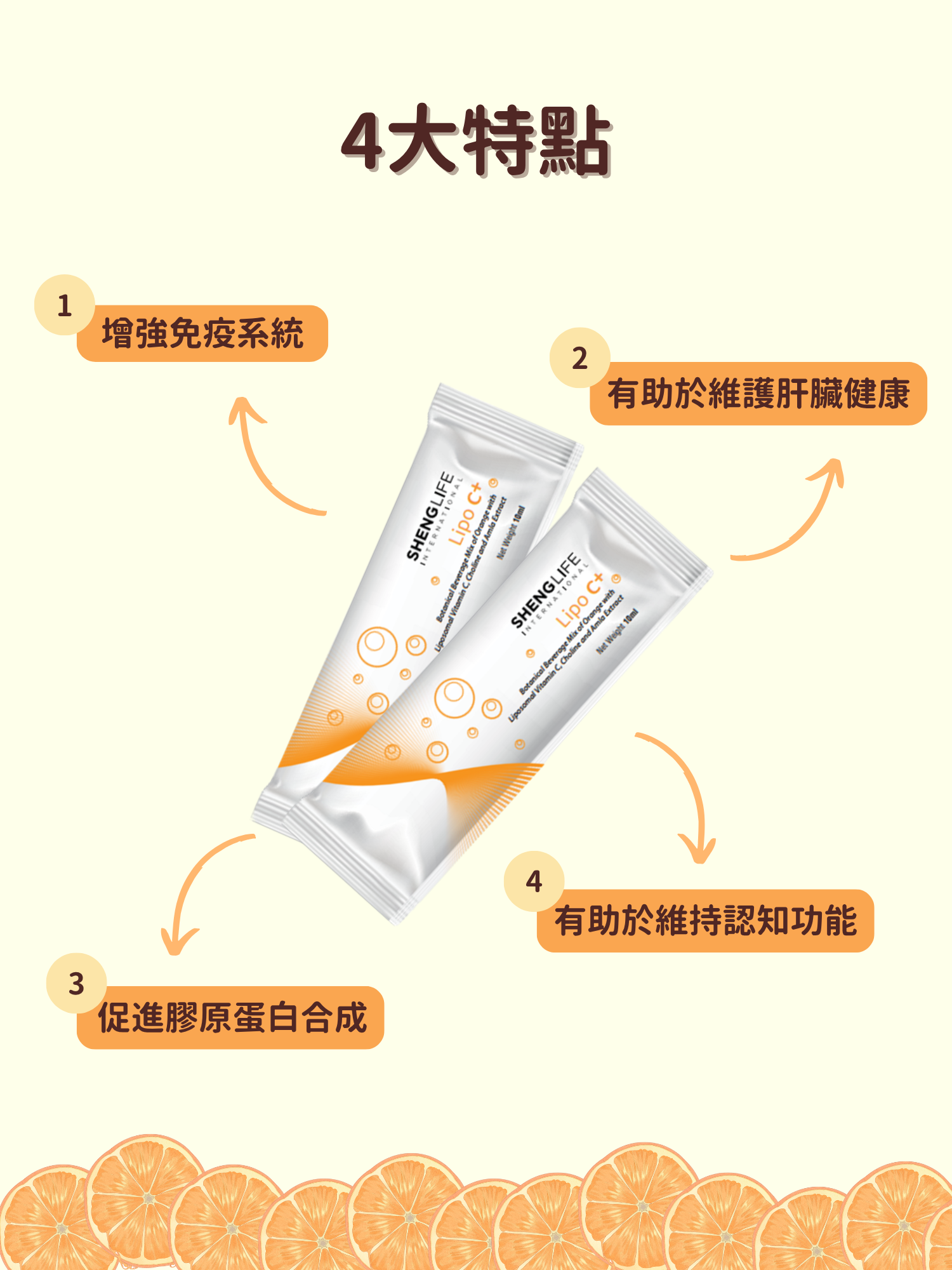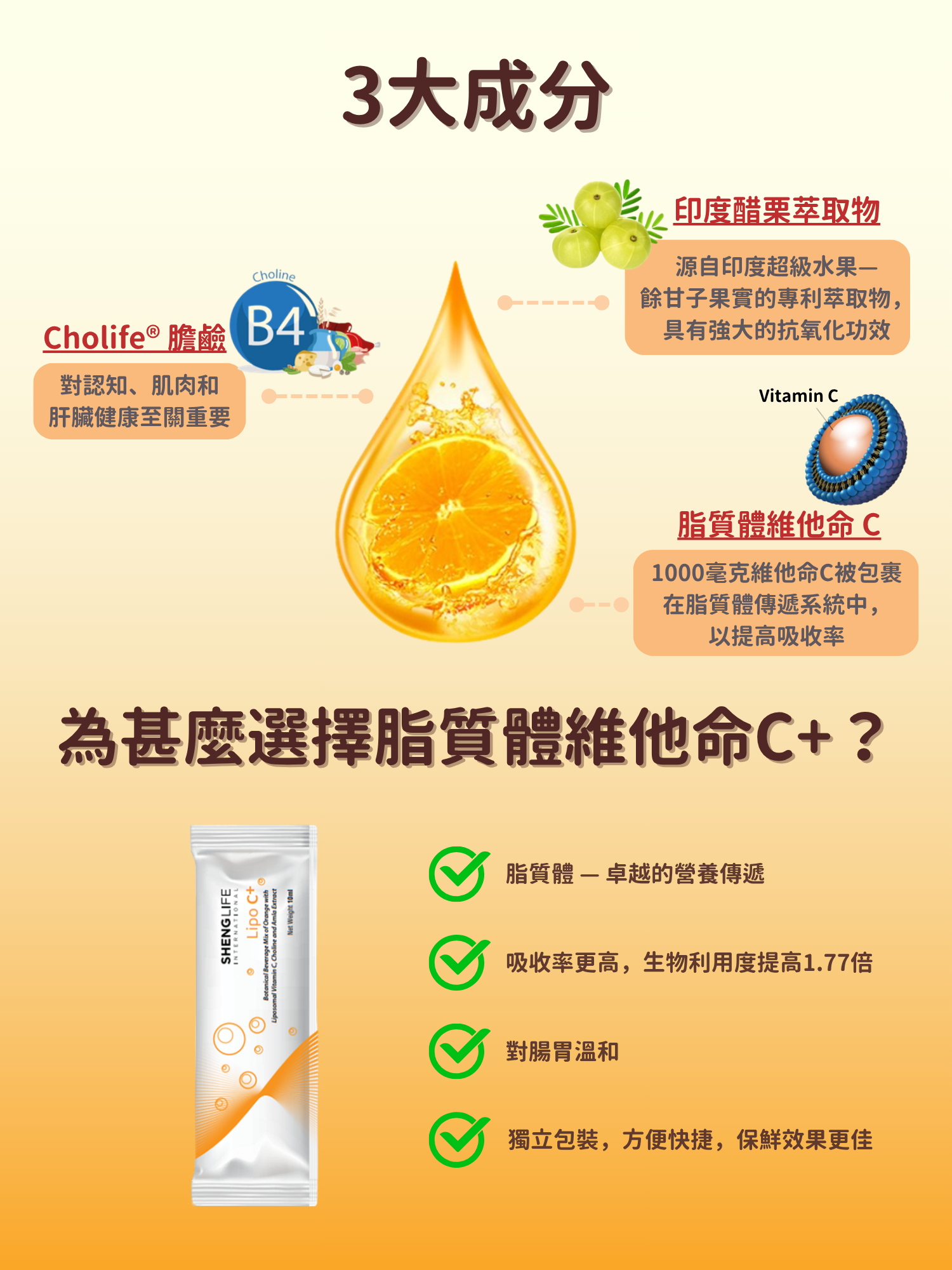 含有脂質體維生素 C、Cholife® 膽鹼和 Amvigour™ 印度醋栗萃取物,有助於增強免疫防禦力與整體免疫系統健康